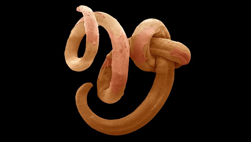 Una microscopia elettronica a scansione (SEM) colorata di un nematode, parassita dell'intestino tenue in numerosi animali. Foto di Steve Geschmeissner / Science Photo Library