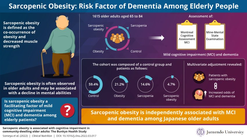 Hanno scoperto che il 59,4% della popolazione non aveva né obesità né sarcopenia, il 21,2% aveva obesità, il 14,6% aveva sarcopenia e il 4,7% della popolazione aveva obesità sarcopenica. I partecipanti con obesità sarcopenica avevano il tasso massimo di MCI e demenza, seguiti da quelli con sarcopenia, obesità e infine dal gruppo di controllo.
