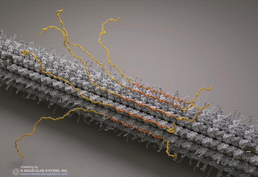 Nel nuovo studio, la Ori-McKenney, McKenney e dei collaboratori in Repubblica Ceca hanno condotto una serie di esperimenti con proteine tau e microtubuli isolati. Hanno scoperto non solo che la tau può autoassemblarsi per formare un involucro attorno ai microtubuli, ma che, quando lo fa, stringe il microtubulo in una forma più compatta. Può farlo perché i microtubuli sono costituiti da coppie (dimeri) di singole proteine di tubulina e resta un po' di schiacciabilità - circa 2 angstrom - tra i dimeri.