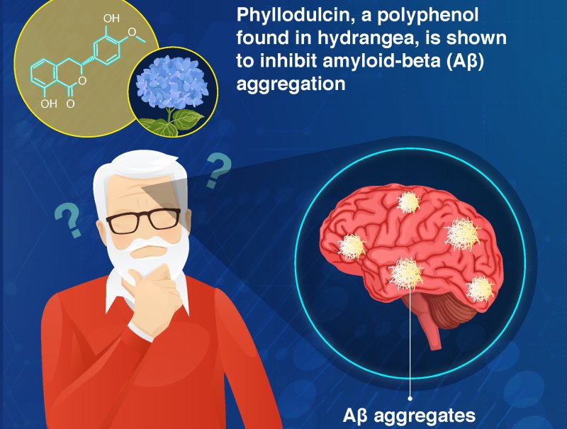 Uno di questi agenti terapeutici potrebbe essere la filloduclina, un agente dolcificante naturale che si trova nell'Hydrangea macophylla var. thunbergia, una pianta origiaria del Giappone. Studi precedenti hanno dimostrato che la filloduclina, un tipo di polifenolo, può penetrare efficacemente la barriera emato-encefalica e distribuirsi uniformemente nel cervello. Inoltre, ricerche recenti suggeriscono che i polifenoli possono inibire anche l'aggregazione di Aβ.