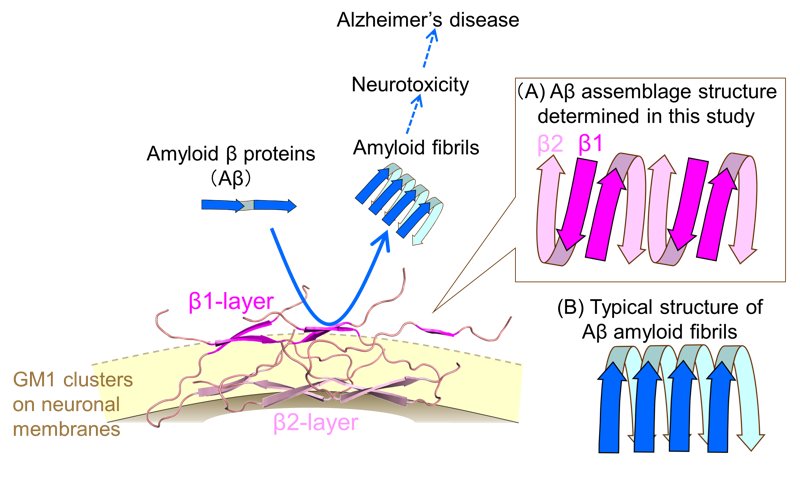 Contrariamente alle fibrille amiloidi Aβ riferite finora, che si allineano in direzione uniforme, l'assemblaggio di Aβ sulle membrane contenenti gangliosidi GM1 presenta una conformazione completamente diversa. In particolare, si è scoperto che lo strato β1, altamente esposto sulla superficie della membrana, funge da catalizzatore, accelerando significativamente la fibrillazione delle molecole Aβ circostanti. Inoltre, è emerso che gli anticorpi anti-GM1-Aβ riconoscono specificamente questa regione.