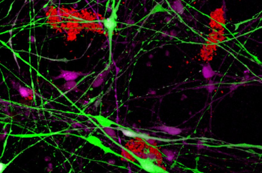 Modello 3D di neuroni umani in un piatto. Verde e viola: neuroni che esprimono proteine danneggiate nel sistema di ubiquitina. Questo danno provoca la patologia tipica dei pazienti di Alzheimer: depositi di amiloidi (in rosso) al di fuori delle cellule.