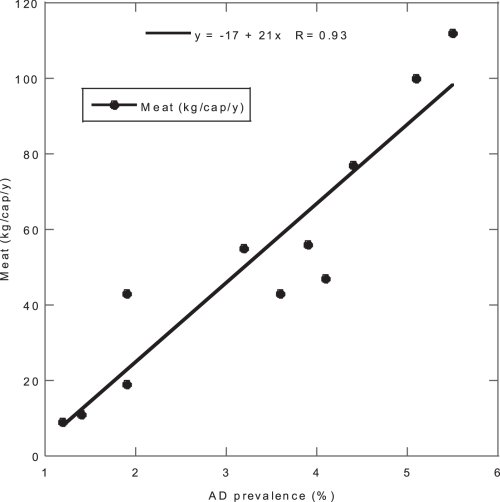 Correlazione tra prevalenza di Alzheimer in 11 paesi considerati nello studio del 1997 rispetto al consumo di carne calcolato dalla FAO.