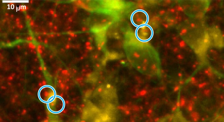 Con l'Alzheimer le cellule nervose mostrano meno connessioni tra loro (sinapsi), qui cerchiate di blu. Metà delle sinapsi sono in rosso e l'altra metà in giallo. (Fonte: Scripps Research)