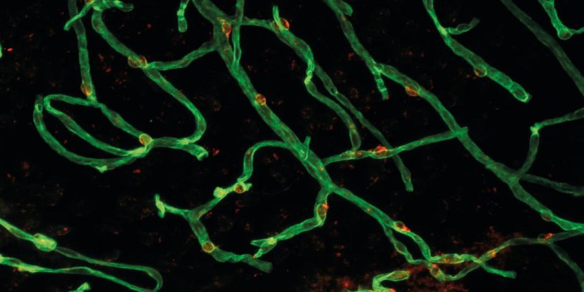 Microvasi di topo al microscopio a fluorescenza (verde=endotelio vascolare, rosso=nuclei cellulari). Fonte: ©Dichgans Lab