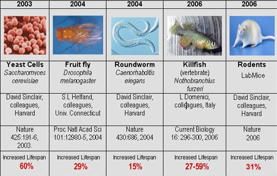 Troati nuovi benefici del resveratrolo, la "molecola del vino rosso"La progressione delle scoperte sull'aumento della longevità (= % Increased lifespan) dall'uso di resveratrolo, in specie sempre più evolute (cellule lievito > moscerini della frutta > vermi nematodi > killifish > roditori)