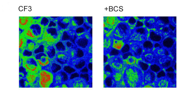 Immagine di scansione a due fotoni del CF3 dimostra che l'aggiunta acuta di dosaggi BCS riduce anche i raggruppamenti labili di rame nei neuroni retinici.Negli ultimi anni si è dimostrato che il rame ha un ruolo essenziale nella salute del cervello umano.