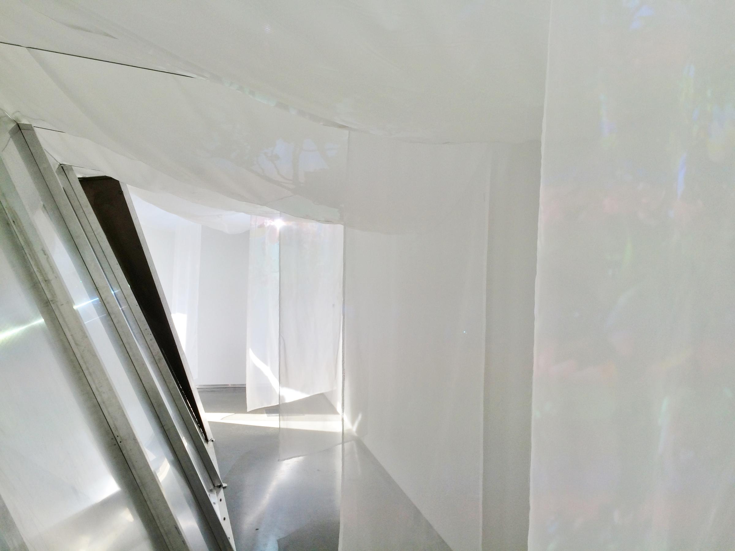 Per iniziare, si cammina attraverso un corridoio stretto, un'installazione dell'artista Babette Allina. Tende di garza bianca sul muro inclinato del corridoio. Immagini di fiori di ciliegio in movimento lento si formano da un video proiettore. E' un po' claustrofobica, alienante. Snyder dice che è intenzionale.