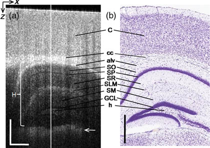 Imamgine in vivo 1.3-micron VCSEL SS-OCT di un topo adulto di 12 settimane con preparazione del cranio: (a) immagine rappresentativa OCT con dati morfologici della corteccia cerebrale e compartimenti cerebrali conseguenti. (b) anatomia cerebrale OCT che mostra una buona correlazione con la microfotografia di una sezione istologica marcata Nissl dello stesso cervello di topo (Fonte: Allen Institute for Brain Science)I ricercatori dell'Università di Washington (UW) hanno usato una tecnologia di scansione non invasiva basata sulla luce per vedere letteralmente all'interno del cervello vivente, fornendoci un nuovo strumento per studiare malattie come la demenza, l'Alzheimer, e i tumori cerebrali che modificano il tessuto cerebrale nel tempo.