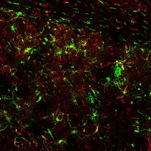 Cellule staminali neurali (verdi) migrano in un sito danneggiato del cervello di topo con DLB e cominciano a differenziarsi in astrociti (rosso), con conseguente miglioramento del funzionamento motorio e cognitivo. (Fonte: Laboratorio Blurton-Jones)Le cellule staminali neurali trapiantate in siti cerebrali danneggiati di topi, hanno migliorato notevolmente il deterioramento sia motorio che cognitivo associati alla demenza con corpi di Lewy, secondo i neurobiologi Sue & Bill Gross dello Stem Cell Research Center dell'Università di California di Irvine e dell'Institute for Memory Impairments and Neurological Disorders.