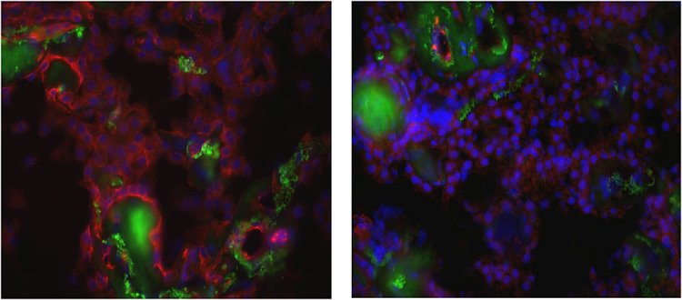 Due colorazioni del plesso coroideo umano. A sinistra un plesso coroideo sano (da donatore con fase Braak 0,1). A destra un plesso coroideo danneggiato dall'Alzheimer (fase Braak 5). In entrambe le immagini i punti blu sono nuclei di cellule. Si notano le stringhe di cellule presenti in forma di cavolfiore, che indicano la struttura del plesso coroideo. In entrambe le immagini c'è anche una colorazione verde simile, che indica l'autofluoresenza dell'invecchiamento tissutale. Nella figura a sinistra (plesso coroideo sano) c'è una considerevole colorazione rossa della proteina Claudin 5, mentre la stessa è quasi assente nella foto a destra. Questi dati indicano che la proteina Claudina 5 è assente nella barriera del plesso coroideo danneggiato e, di conseguenza, detta barriera probabilmente ha delle perdite nell'Alzheimer.