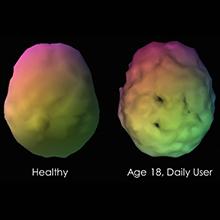 Esempio di immagine cerebrale SPECT (vista dall'alto verso il basso) che mostra il flusso sanguigno cerebrale di un controllo sano (=healthy), rispetto ad un 18-enne che fa uso quotidiano di marijuana (=Age 18. Daily user). Mentre il soggetto di controllo ha un'attività simmetrica, il fumatore di marijuana nel complesso mostra una minore perfusione.Mentre negli USA si fa a gara (stato dopo stato) per legalizzare la marijuana per uso medicinale e ricreativo, un nuovo studio di scansione cerebrale su larga scala dà motivi di cautela.