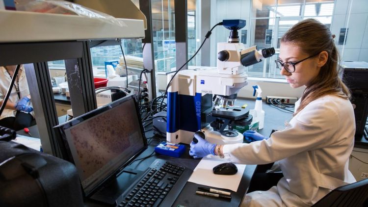La ricercatrice Simona Belfiore del Centro Ricerca Malattie Neurodegenerative dell'ASU-Banner, esamina il tessuto cerebrale per individuar i segni rivelatori dell'Alzheimer. (Foto: Deanna Dent, Arizona State University)