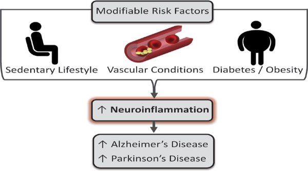 I revisori notano i quattro fattori di rischio modificabili per l'Alzheimer e il Parkinson: inattività fisica, malattie vascolari, obesità e diabete mellito di tipo due. Questi fattori di rischio modificabili contribuiscono alla neuroinflamazione attraverso meccanismi specifici che sono direttamente legati alla patologia delle malattie.