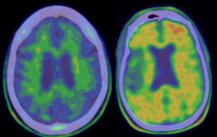 Scansioni PET: a sinistra una scansione 'negativa' (senza patologia di Alzheimer); a destra una scansione 'positiva' di un paziente eleggibile per lo studio clinico del Solanezumab. (Fonte: Columbia University Medical Center)