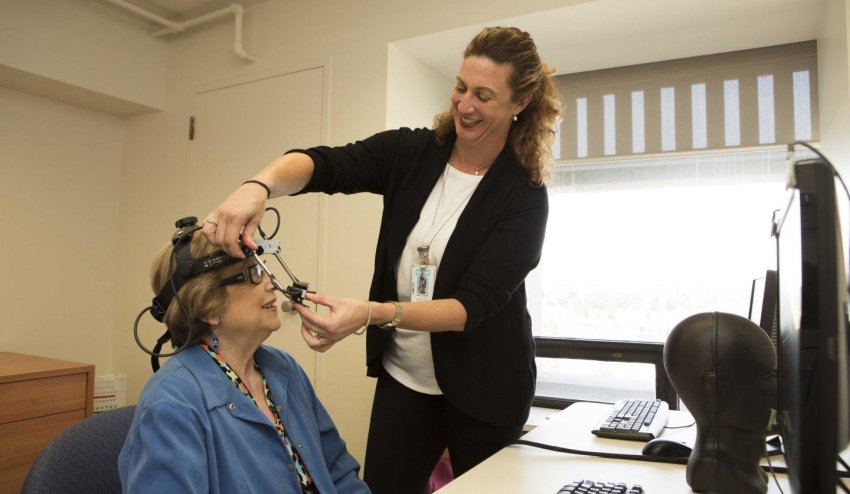 La dott.ssa Jennifer Ryan aggiusta il tracciatore degli occhi su un partecipante allo studio (Foto: Baycrest)