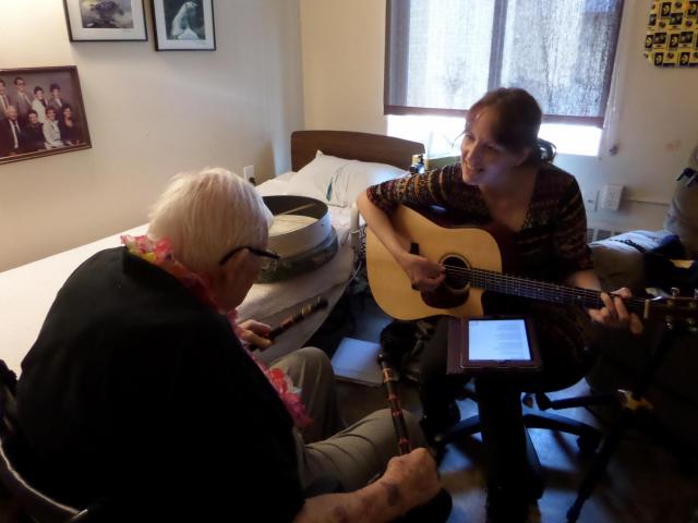 La ricercatrice Alaine E. Reschke-Hernández canta e suona la chitarra per un ospite di una casa di cura. (Foto: Andrea Mahoney / Briarwood Healthcare Center)
