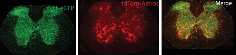 Normalmente, il trasportatore di glutammato è attivo in tutti gli astrociti. Ma usando segmenti di codice DNA compresi tra 1.000 e 7.000 bit dall'interruttore on-off del glutammato, tutte le cellule del cervello si illuminarono di rosso, compresi i neuroni. Solo quando i ricercatori hanno provato la sequenza più grande di un codice DNA a 8.300 bit da questa posizione, hanno iniziato a vedere una selezione nelle cellule rosse. Queste cellule rosse erano tutti astrociti ma solo in alcuni strati della corteccia cerebrale nei topi.