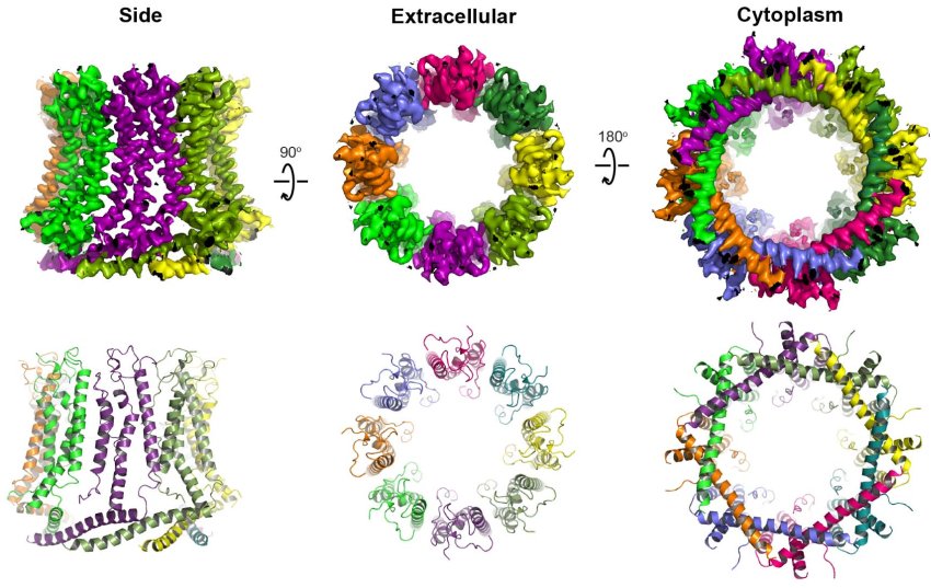 Un poro CALHM1 visto dal lato (side), dall'esterno (extracellular) e dall'interno (cytoplasm) della cellula.