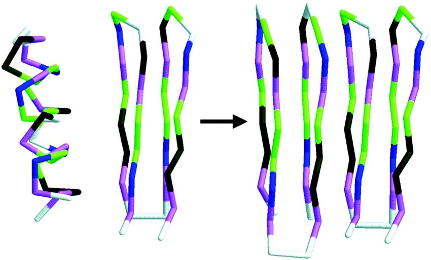 Un modello di propagazione delle malattie da prioni. La forma corretta (elicoidale) di una proteina si ripiega erroneamente in una struttura a β in presenza della forma mal ripiegata della struttura β rigida. (Fonte: Edyta Małolepsza et al.)