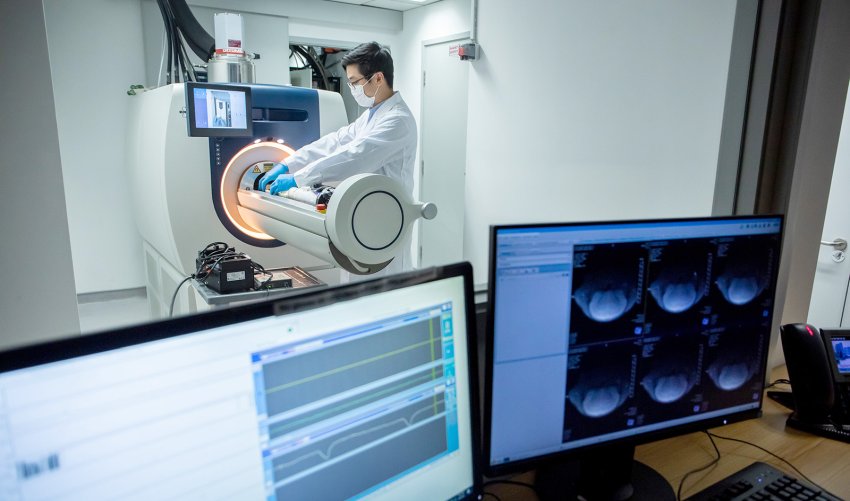 Il team effettua esperimenti sui topi con lo scanner animale MRI 3T alla City University di Hong Kong.