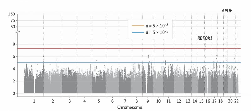 Le varianti genetiche RBFOX1 e APOE sono state associate ai livelli di amiloide nel cervello di persone a rischio di Alzheimer. (Fonte: Raghavan, et al.)