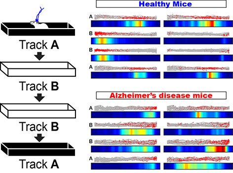 Il nuovo studio rivela che nei topi con Alzheimer è interrotta la 'rimappatura' delle cellule di posizione, una funzione cerebrale che discrimina ambienti diversi. In figura il passaggio dei topi da A > B e da B > A, per animali sani (sopra) e con sintomi di Alzheimer (sotto). La mappatura (colore) è completamente diversa.I pazienti con morbo di Alzheimer (MA) spesso soffrono di perdita di memoria spaziale, come non riconoscere dove sono, e dimenticare dove hanno messo le cose.