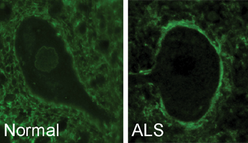 Un pezzo del puzzle della demenza frontotemporale e della SLA è nel trasporto cellulareAnticorpi circondano un motoneurone sano (a sinistra) e sono invece passati sulla membrana cellulare esterna nella SLA (a destra). Fonte: University of TorontoPur essendo la causa più comune della sclerosi laterale amiotrofica (SLA) e della demenza frontotemporale (FTD), fino ad ora gli scienziati non capivano come un gene specifico potesse causare queste malattie devastanti.