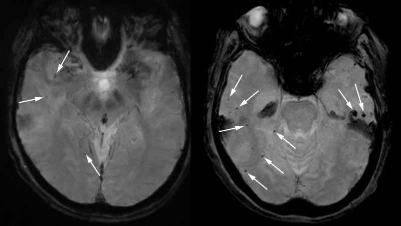 case of alzheimer antibody microbleeding scansPrima che la donna della Florida ricevesse il lecanemab, una scansione MRI (sinistra) mostrava alcune microemorragie: piccoli sanguinamenti (macchie scure segnate da frecce). Dopo (destra), erano evidenti dozzine di microemorragie. (Fornita anonimamente a Science)