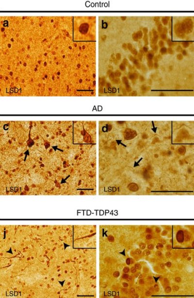 Sopra: espressione dell'LSD1 nella corteccia frontale (a) e nell'ippocampo (b) di un animale coetaneo di controllo. Centro: immunoreattività dell'LSD1 nella corteccia frontale di Alzheimer su aggregati di tipo grovigli (c, frecce) e neuriti (d, frecce). Sotto: immunoreattività dell'LSD1 nella FTD-TDP43, sui depositi di neuriti della corteccia frontale (j, punte) e sulle inclusioni citoplasmiche dell'ippocampo (k, punte). Fonte: Christopher et al.Degli scienziati hanno scoperto che la rimozione del gene regolatorio LSD1 nei topi adulti induce cambiamenti nell'attività genica che assomigliano inaspettatamente a quelli dell'Alzheimer.