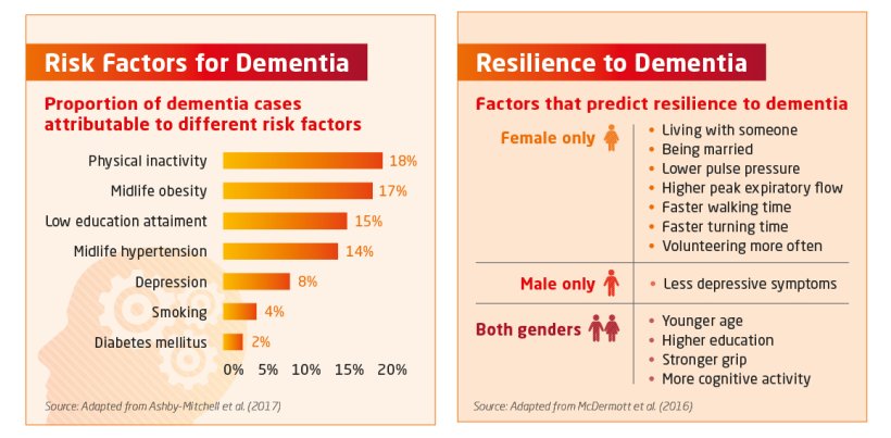 A sinistra i fattori di rischio della demenza (dall'alto: inattività fisica, obesità in mezza età, poca istruzione, ipertensione in mezza età, depressione, fumo, diabete mellito). A destra i fattori di resilienza (donne solo: vivere con qualcuno, essere sposate, pressione bassa, flusso di picco espiratorio alto, ritmo di camminata veloce, tempo veloce di svolta e molto volontariato. Uomini solo: pochi sintomi depressivi. Entrambi: età inferiore, alta istruzione, controllo più saldo e più attività cognitiva).