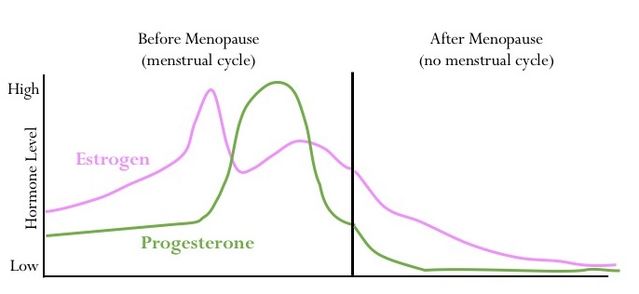 Cambio dei livelli di estrogeni e progesterone prima, durante e dopo la menopausa (Fonte: Stephanie Koebele)