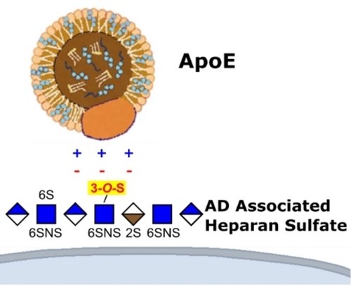 L'interazione ApoE-eparan solfato (ES) della superficie cellulare è migliorata da un raro gruppo 3-O-O-sulfo collegato all'Alzheimer. Questo motivo di legame è condiviso con la proteina tau, il che suggerisce un meccanismo delle interazioni ApoE/tau nell'associazione di alcune isoforme ApoE con MA. (Fonte: Mah et al.)