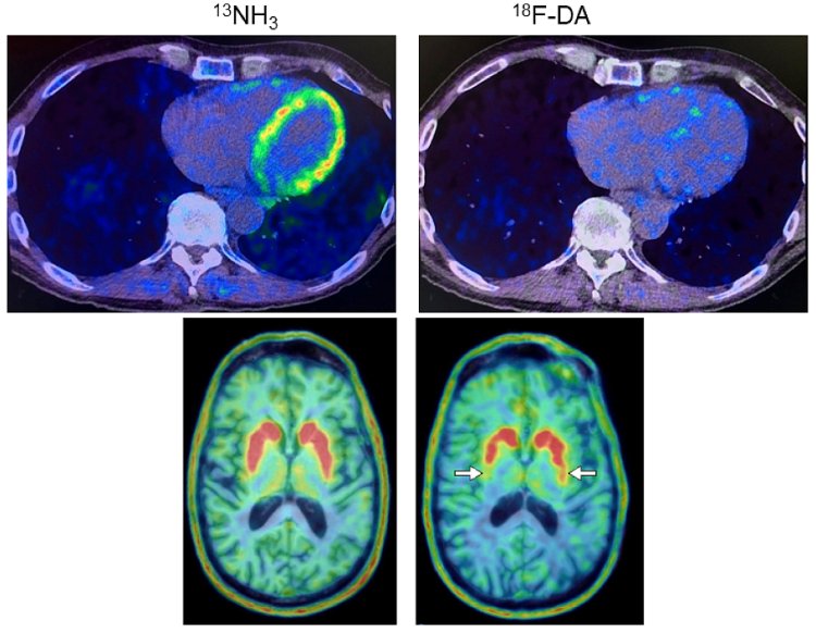Scansioni PET cerebrali di un partecipante allo studio con il Parkinson supportano una progressione 'corpo prima'. Le due scansioni sopra evidenziano una bassa radioattività 18F derivata da dopamina nel cuore (destra con 13N-Ammmonia, sinistra PET). In seguito, le scansioni cerebrali hanno mostrato una perdita di neuroni produttori di dopamina e l'individuo ha sviluppato sintomi della malattia. (Fonte: Goldstein Lab / NINDS)