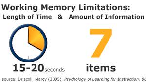 I limiti della memoria di lavoro: 15/20 secondi di tempo e 7 esperienze.E' necessaria la memoria di lavoro per trattenere una informazione per un breve periodo di tempo.