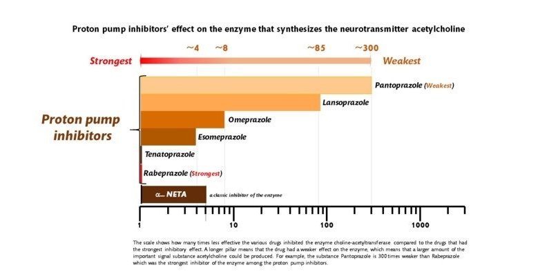 I ricercatori hanno poi analizzato l'effetto di questo legame, scoprendo che tutti i farmaci inibiscono l'enzima, con conseguente riduzione della produzione di acetilcolina; dove il legame è più forte, maggiore è l'effetto inibitorio. I farmaci basati sui principi attivi omeprazolo, esomeprazolo, tenatoprazolo e rabeprazolo hanno la maggiore affinità, ed sono perciò forti inibitori dell'enzima, mentre le varianti pantoprazolo e lansoprazolo sono più deboli (vedi figura sopra).