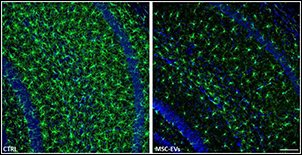 Delivery of extracellular vesicles from stem cellaffects microglia activationL'iniezione intranasale di vescicole extracellulari derivate da cellule staminali mesenchimali (MSC-EV), influenza l'attivazione delle microglia nel cervello di topo. Nell'immagine la distribuzione di microglia (verde) nella regione CA1 mediale dell'ippocampo di un topo di controllo (sinistra) e uno trattato (destra).Nella ricerca di una cura per il morbo di Alzheimer (MA), le cellule staminali mesenchimali e le loro vescicole extracellulari derivate ​​(MSC-EV), si dimostrano molto promettenti grazie alle loro proprietà protettive e antinfiammatorie.
