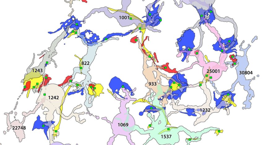 Immagine 2-D patoconnettoma mostra dendriti di cellule bipolari e le posizioni delle loro sinapsi con fotorecettori ad asta (rosso), a cono (blu) e indeterminati (giallo).