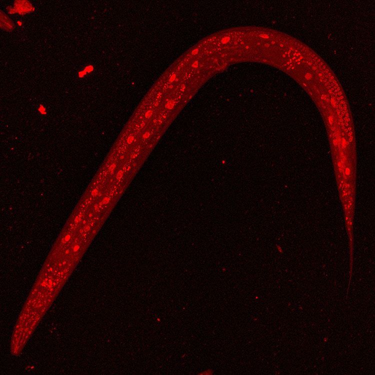 La proteina NHR-66 nel nematode C. elegans, marcato con proteina rosso fluorescente. (Foto: University of Basel, MCN)