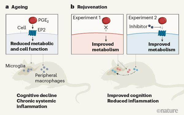 I macrofagi di topi e umani anziani, hanno osservato, non solo producono molti più PGE2 rispetto a quelli più giovani, ma hanno anche un numero molto maggiore di EP2 sulla loro superficie. La Andreasson e i suoi colleghi hanno anche confermato aumenti significativi dei livelli di PGE2 nel sangue e del cervello dei topi anziani.