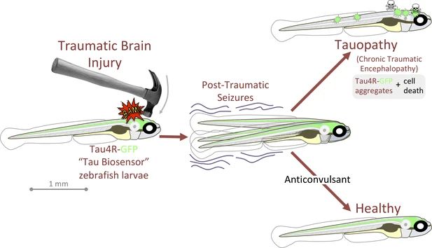 Anticonvulsivanti invertono la tauopatia e la morte cellulare esibite dalle larve di zebrafish dopo la lesione cerebrale traumatica.