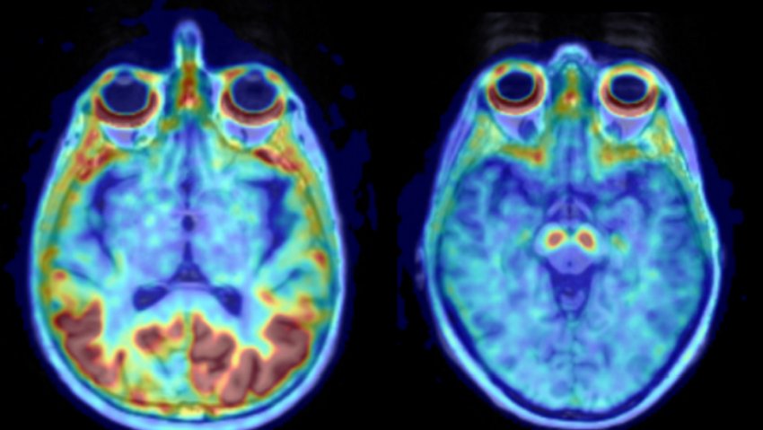 Assorbimento di tau patologica (sinistra) e un cervello sano (destra). Fonte: Ruben Smith