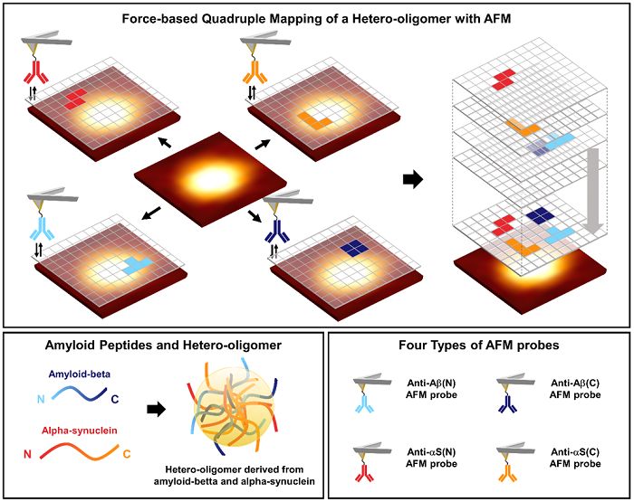 Quando il team di ricerca ha studiato con AFM 4 indizi immobilizzati con anticorpi che riconoscono N-Terminus o C-terminus di ciascun peptide, ha assodato che tutti gli aggregati erano etero-oligomeri. Inoltre, nel caso di etero-oligomero, hanno chiarito che la probabilità di riconoscere la fine del peptide è superiore a quella dell'omo-oligomero (aggregato proteico derivato da un singolo peptide di amiloide-beta o alfa-sinucleina).